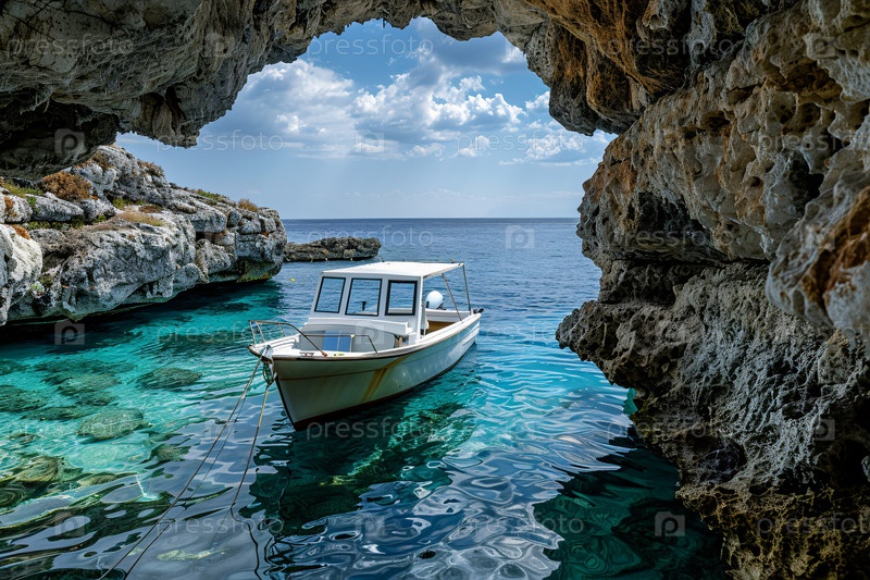 Роскошная яхта, проходящая через Голубую пещеру в живописном месте отдыха на море