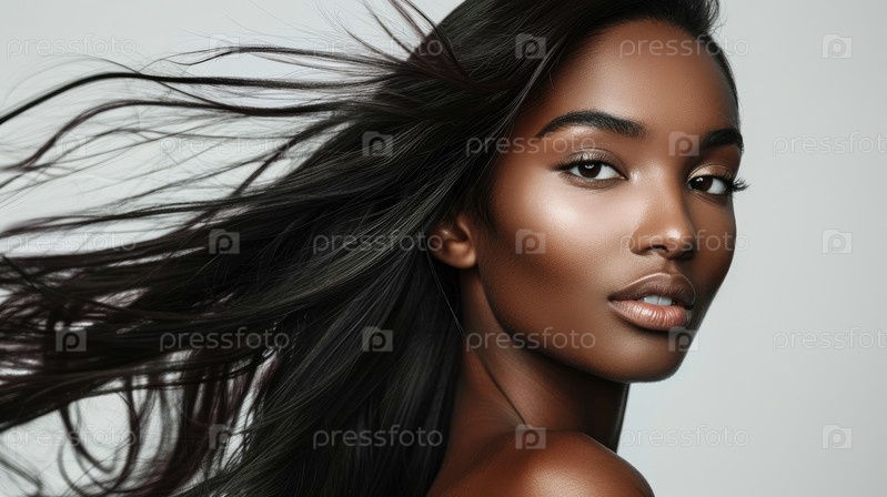 Шелковистые темные волосы в элегантном движении. Студийный портрет