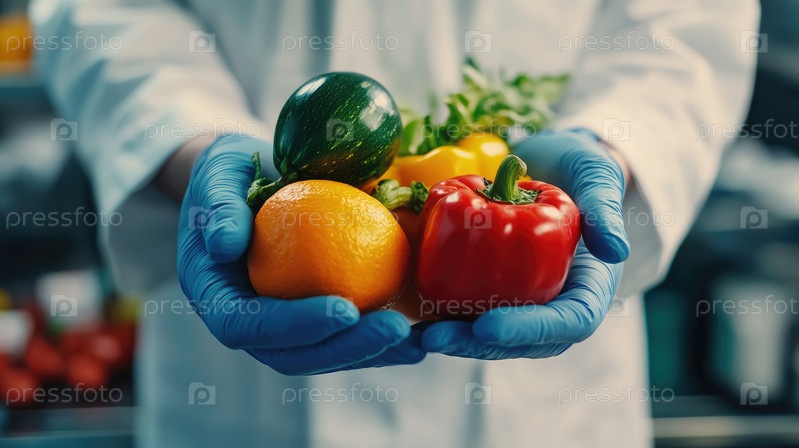 Человек в лабораторных условиях изучает различные фрукты и овощи, включая апельсин, болгарский перец, цуккини и лук, подчеркивая важность питания и здорового питания