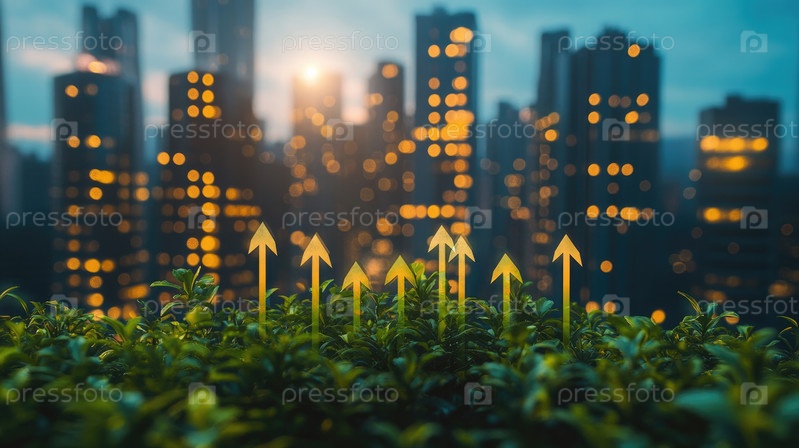 На изображении изображен яркий рост растений под неоновыми стрелками, символизирующий прогресс в области городских экологически чистых инноваций