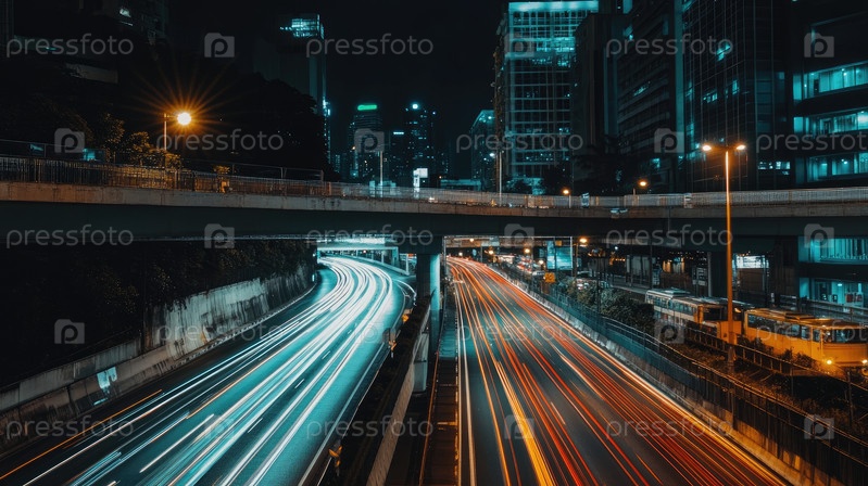 Динамичный городской пейзаж демонстрирует оживленные автомагистрали с быстро движущимися огнями под ярким ночным небом