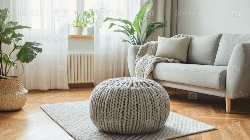 Уютная гостиная в стиле минимализма с вязаным пуфом и зелеными акцентами