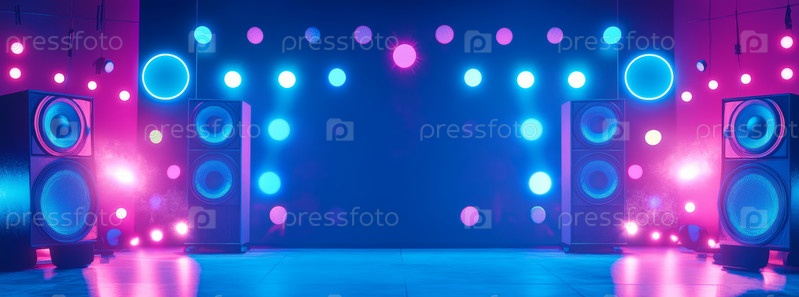 Ночной неоновый танцпол с динамиками и яркими огнями