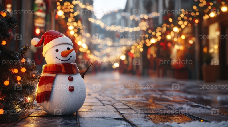 Веселый снеговик в красной шапке и шарфе украшает праздничную городскую улицу, освещенную светящимися огнями