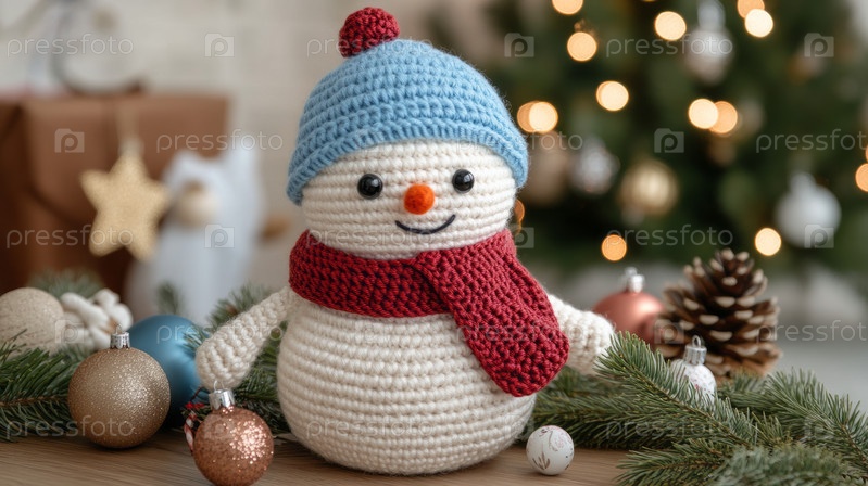 Праздничный вязаный крючком снеговик с праздничными украшениями