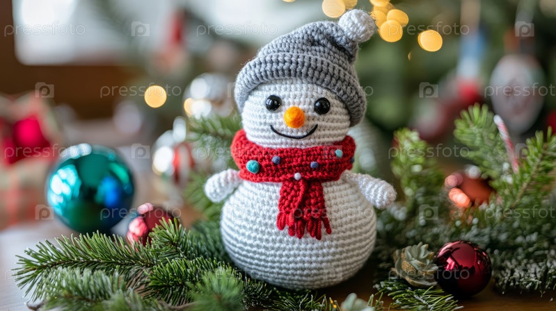 Праздничный вязаный крючком снеговик с праздничными украшениями