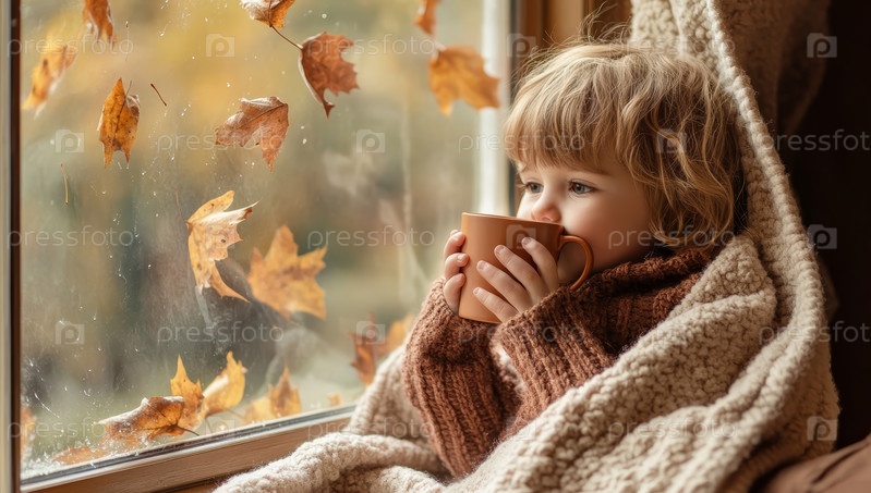 Ребенок, закутанный в уютный свитер, наслаждается теплой чашкой чая у окна, любуясь нежной красотой падающих осенних листьев, наслаждаясь безмятежным осенним мгновением