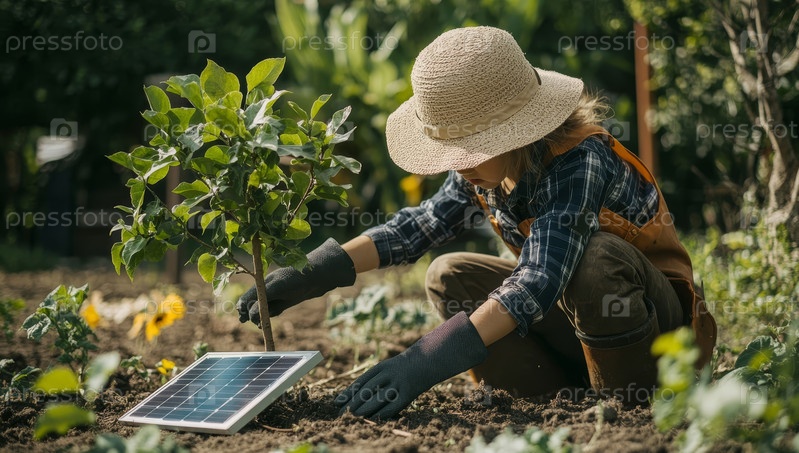 Молодой садовник ухаживает за растениями в залитом солнцем саду, демонстрируя гармонию между устойчивым образом жизни и современными технологиями с помощью солнечной панели