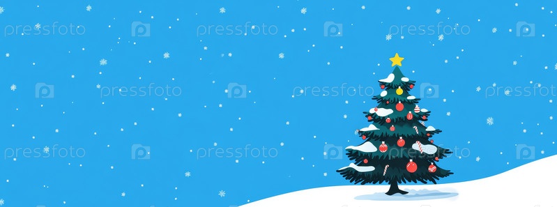Покрытая снегом рождественская елка безмятежно возвышается на фоне огромного снежного пейзажа, украшенная игрушками и увенчанная сияющей звездой