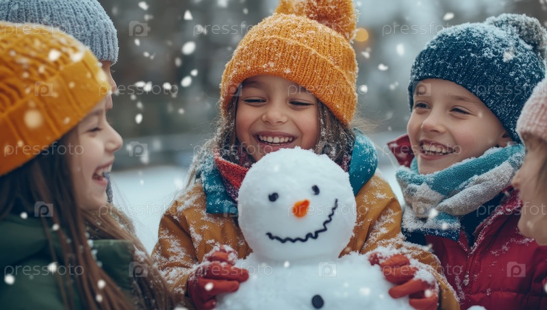 Радостный зимний день с детьми, которые вместе лепят снеговика