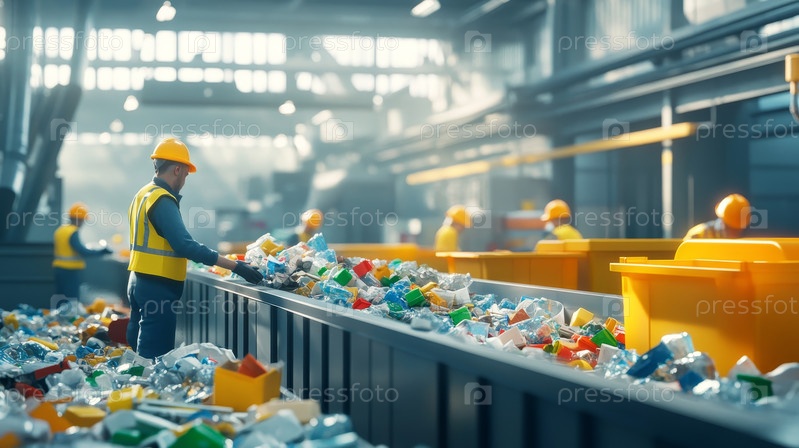 На этом ярком изображении запечатлены совместные усилия рабочих на промышленном заводе по переработке отходов, подчеркивающие важность сортировки отходов для экологической устойчивости