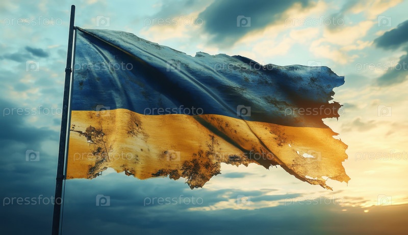 Разорванный украинский флаг на фоне драматического неба, символизирующий конфликт и стойкость