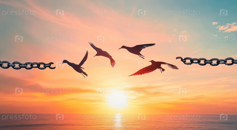 Освобождение: птицы, парящие за пределами цепей на закате