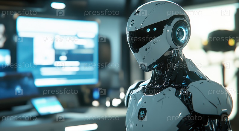 Футуристический робот в стильном офисе с современным дизайном интерьера