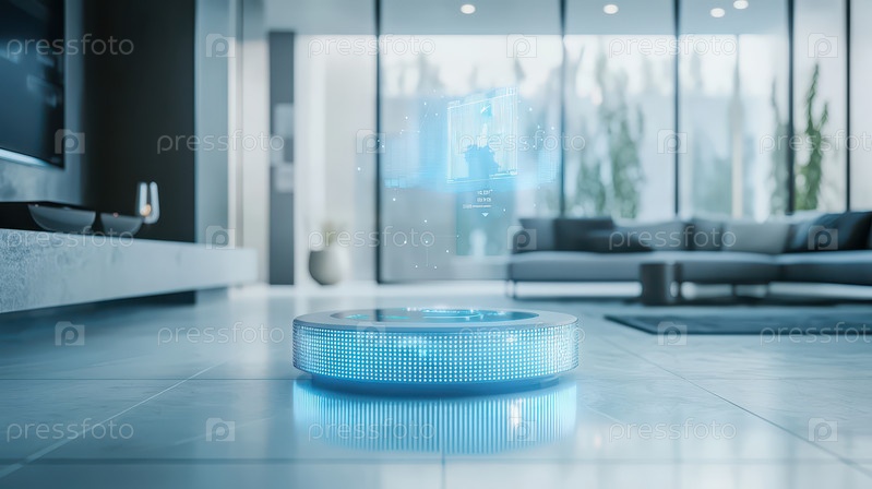 Футуристическое устройство для умного дома с голографическим дисплеем в современной гостиной