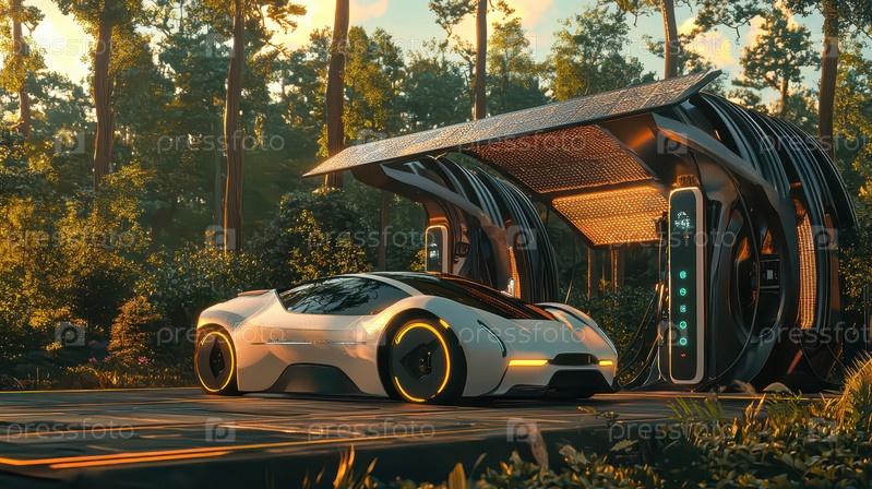Футуристический белый электромобиль заряжается на солнечной станции