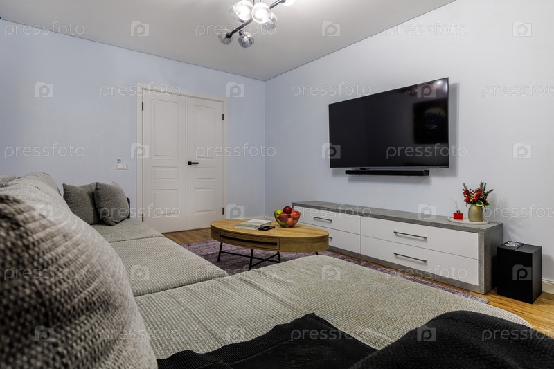 Уютная гостиная с современной мебелью, стильным телевизором и стильным журнальным столиком, создающая комфортное и уютное пространство