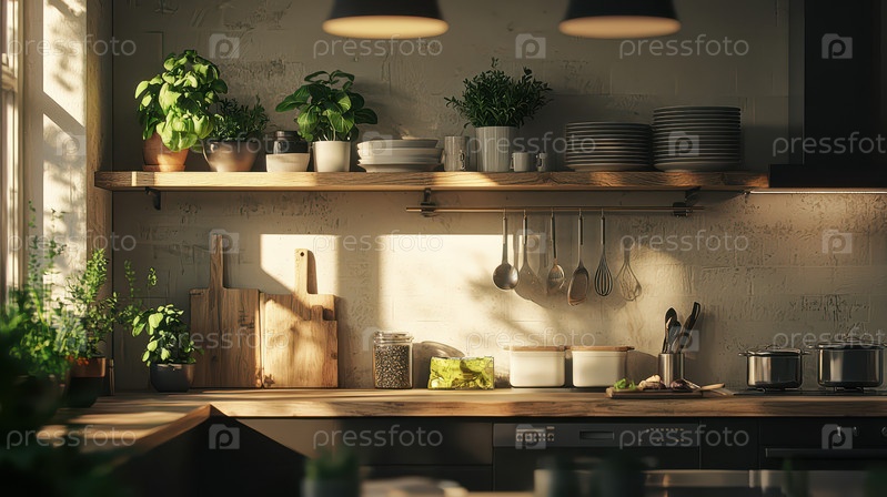 Современная кухонная полка с растениями, тарелками и столовыми приборами