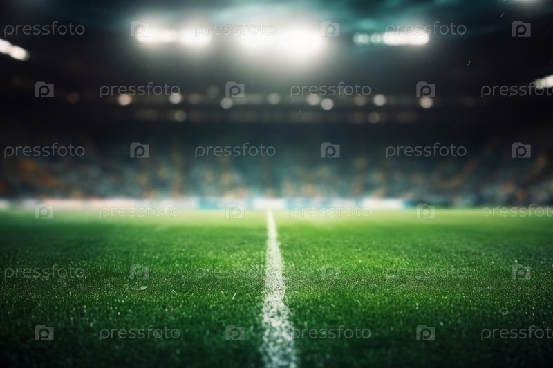Пустой футбольный стадион с пышной зеленой травой на переднем плане, демонстрирующий огромные размеры спортивной арены
