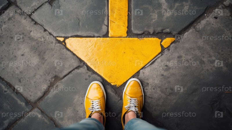 Человек стоит на мокрой улице в желтых ботинках. Это изображение можно использовать для изображения городского образа жизни или дождливой погоды