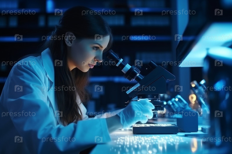 Женщина-ученый внимательно изучает образцы под микроскопом в лаборатории
