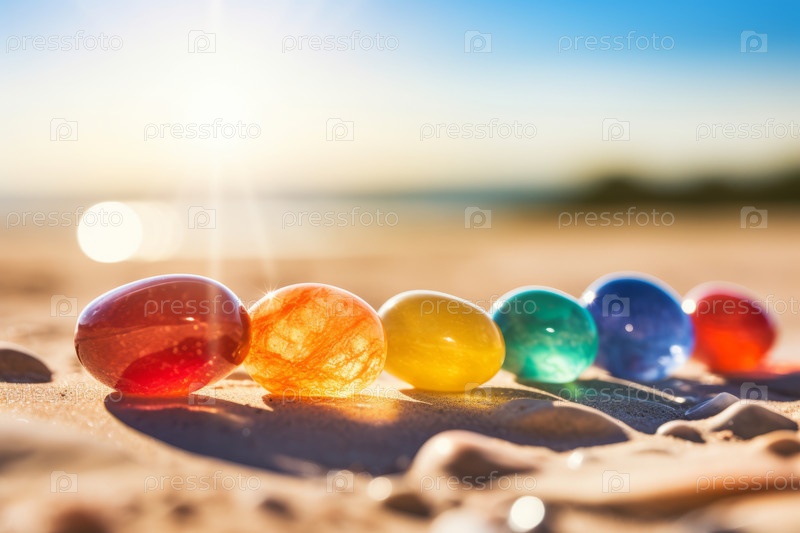 Яркие, красочные стеклянные драгоценные камни сверкают на солнце на песчаном пляже с видом на океан