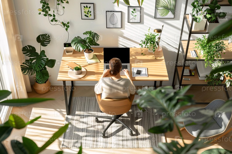 Современный домашний офис с естественным освещением и обилием зелени