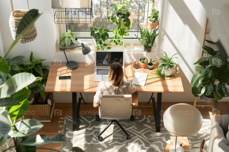 Современный домашний офис с естественным освещением и обилием зелени