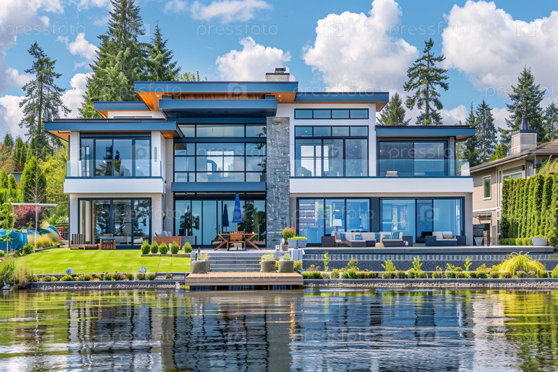 Элегантный современный дом на берегу озера с большими стеклянными стенами и пирсом