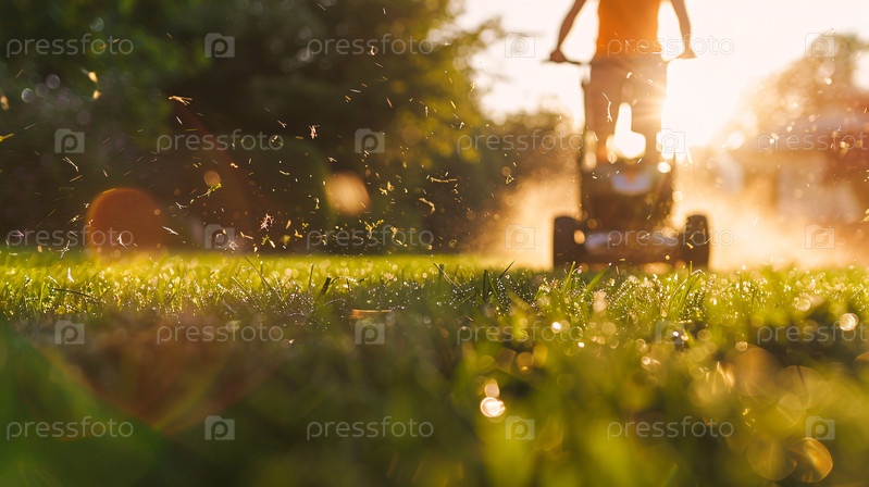 Крупный план газонокосилки, стригущей траву в солнечный день