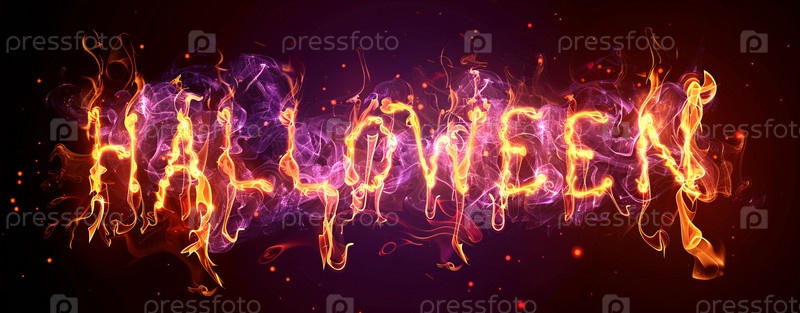 Огненный текст на Хэллоуин со светящимся пламенем и таинственным дымом
