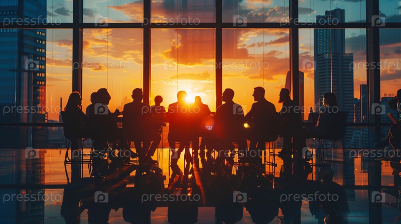 Совместная работа команды в офисе со стеклянными стенами на закате