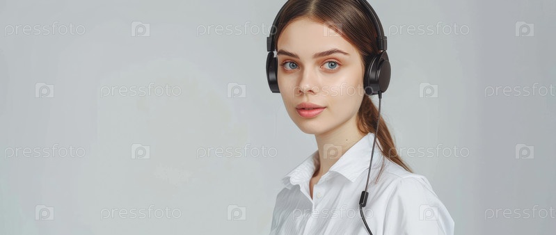 Агент службы поддержки одет в наушники и белую рубашку, что говорит о профессиональной рабочей обстановке
