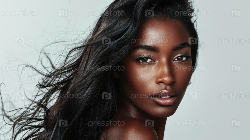 Шелковистые темные волосы в элегантном движении. Студийный портрет