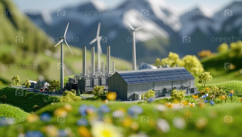 Фабрика возобновляемой энергии среди зеленого ландшафта