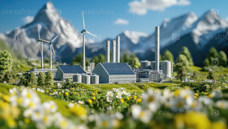 Фабрика возобновляемой энергии среди зеленого ландшафта
