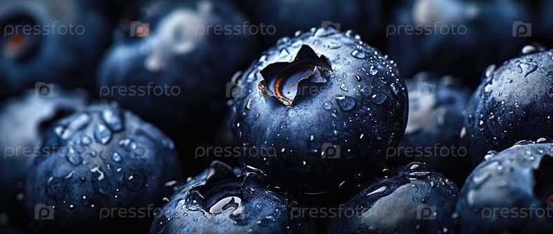 Сочные ягоды черники покоятся на зеленых листьях, на поверхности которых блестят капельки росы