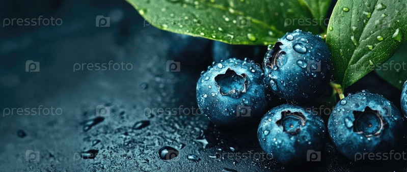 Свежая черника, покрытая каплями росы на зеленых листьях