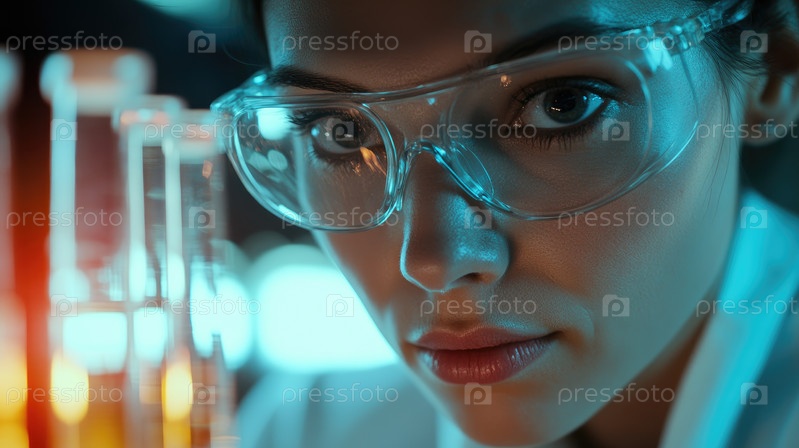 Ученый проводит эксперимент в лаборатории с различной стеклянной посудой