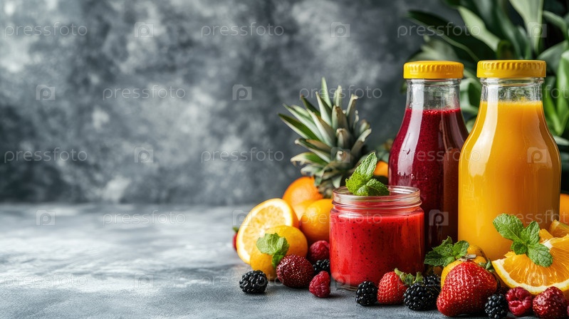 Яркая экспозиция разноцветных фруктовых соков в бутылках, окруженных свежими фруктами и листьями мяты