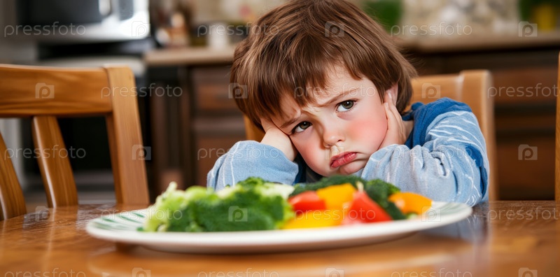 Ребенок с овощами на столе в современной кухне