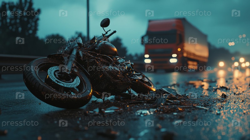 Сцена столкновения мотоцикла и грузовика дождливым вечером