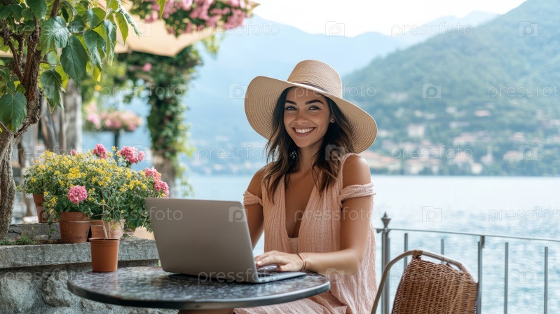 Удаленная работа в живописном месте на берегу озера с горами на заднем плане