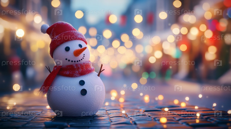 Праздничный снеговик в огнях ночного города