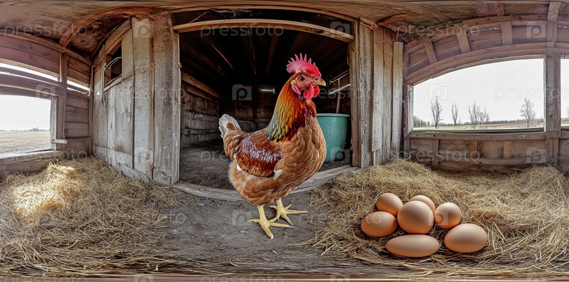 В тепле деревенского амбара куры собираются вокруг только что снесенных яиц, олицетворяя мирную сущность сельской фермерской жизни