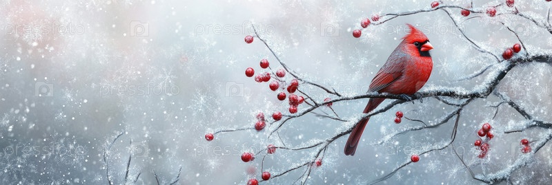 Яркий красный кардинал грациозно восседает на заснеженной ветке, окруженный мирным зимним пейзажем