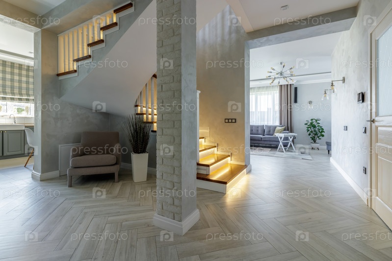 Светлый современный дом с открытой планировкой, стильной лестницей со светодиодной подсветкой, уютной гостиной и элегантным полом