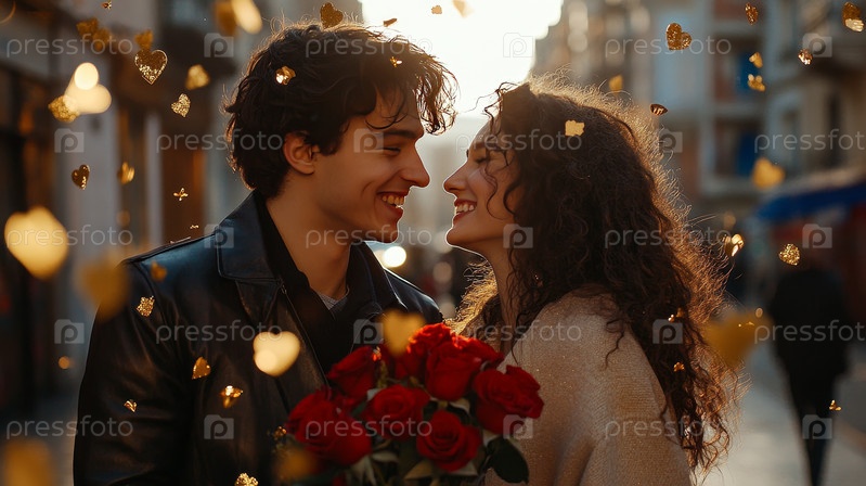 Пара разделяет интимный момент в окружении яркого света и красных роз, создающих уютную и романтическую атмосферу