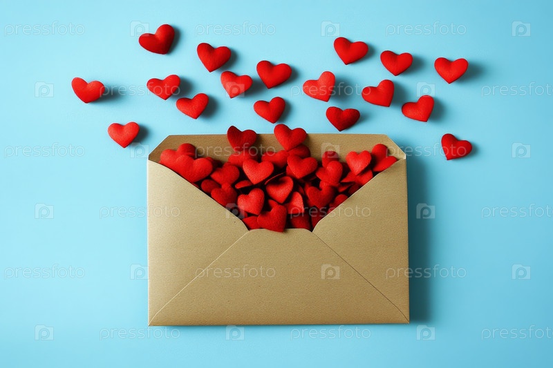 Конверт, наполненный красными сердцами, символизирует излияние любви и привязанности на спокойном голубом фоне