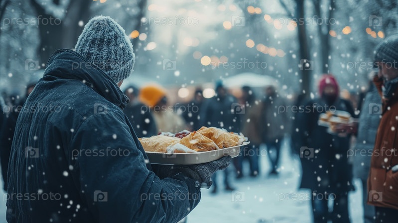На снимке запечатлен трогательный момент совместного приема горячей пищи в холодный день, подчеркивающий сострадание и дух единения